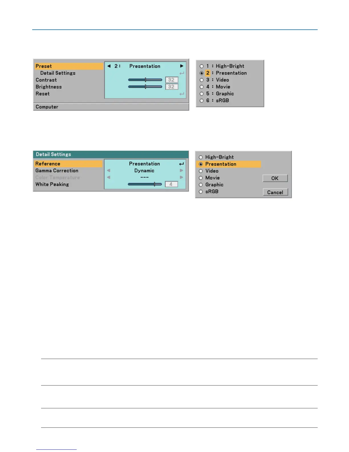 When [High-Bright] or [Presentation] is selected in [Reference], [Color Temperature] is not available.