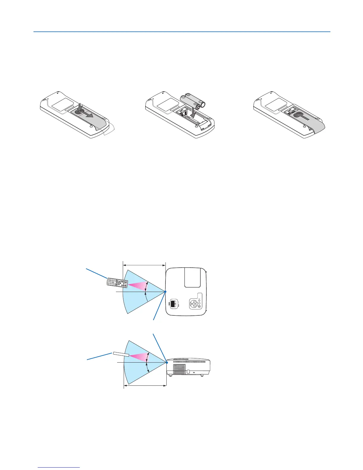 • If you will not be using the remote control for a long time, remove the batteries.