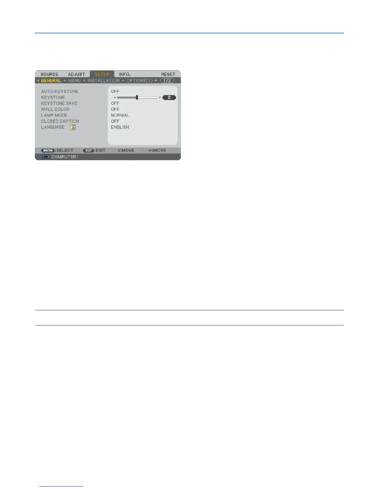 NOTE: When [AUTO KEYSTONE] is set to [ON], [KEYSTONE SAVE] is not available. Next time you turn on the power, the AUTO