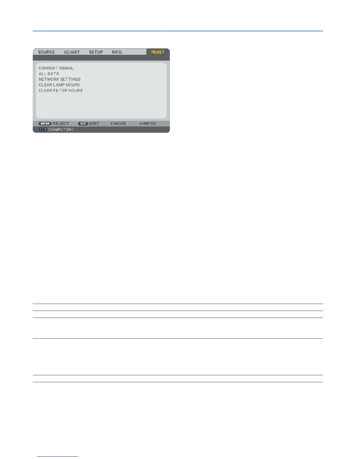 NOTE: Elapsed time of the lamp use will not be affected even when [RESET] is done from the menu.