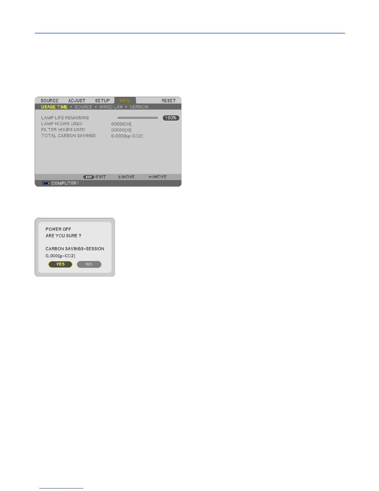 Thisfeaturewillshowenergy-savingeffectintermsofCO2emissionreduction(kg)whentheprojector’s[ECOMODE]