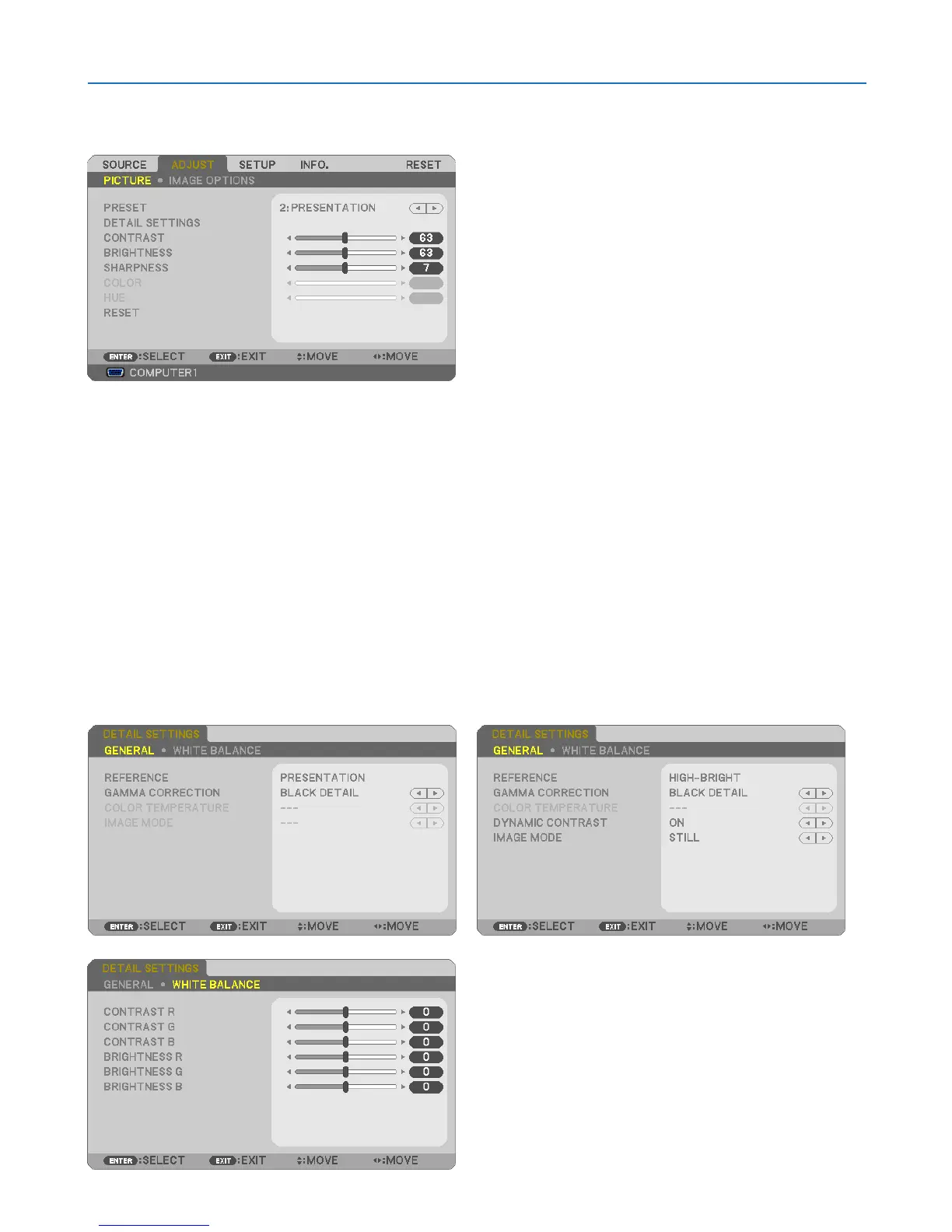 Therearesixfactorypresetsoptimizedforvarioustypesofimages.Youcanalsouse[DETAILSETTINGS]tosetuser