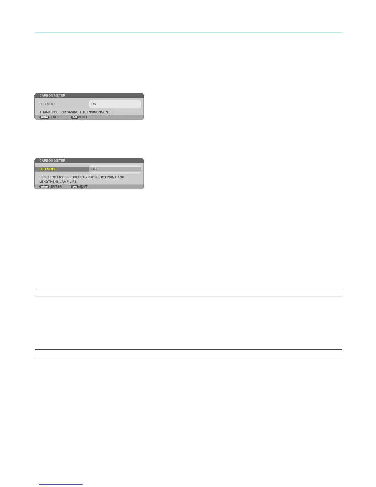 PressingtheENTERbuttonwilldisplaythe[ECOMODE]screen.(→ page 69)