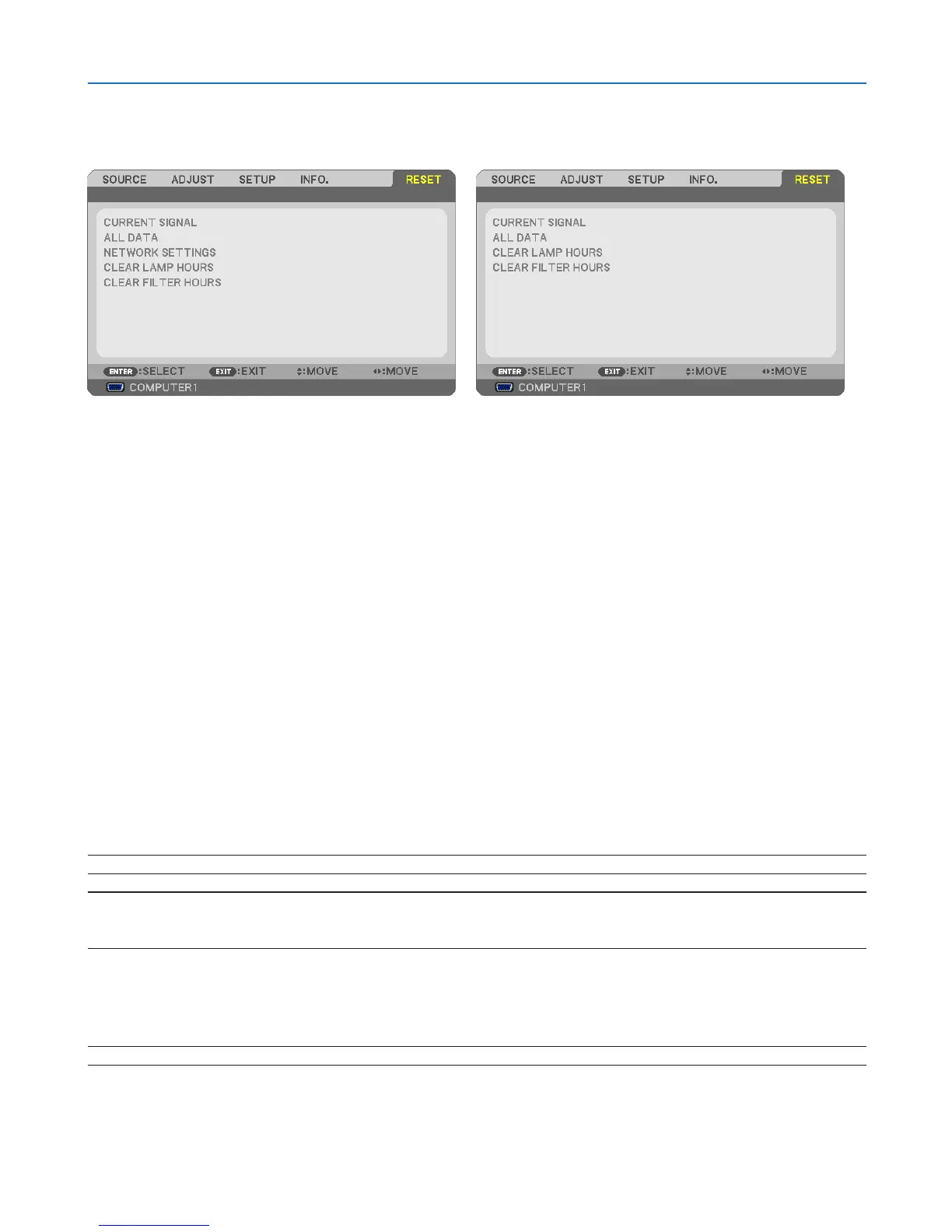 NOTE:Elapsedtimeofthelampusewillnotbeaffectedevenwhen[RESET]isdonefromthemenu.