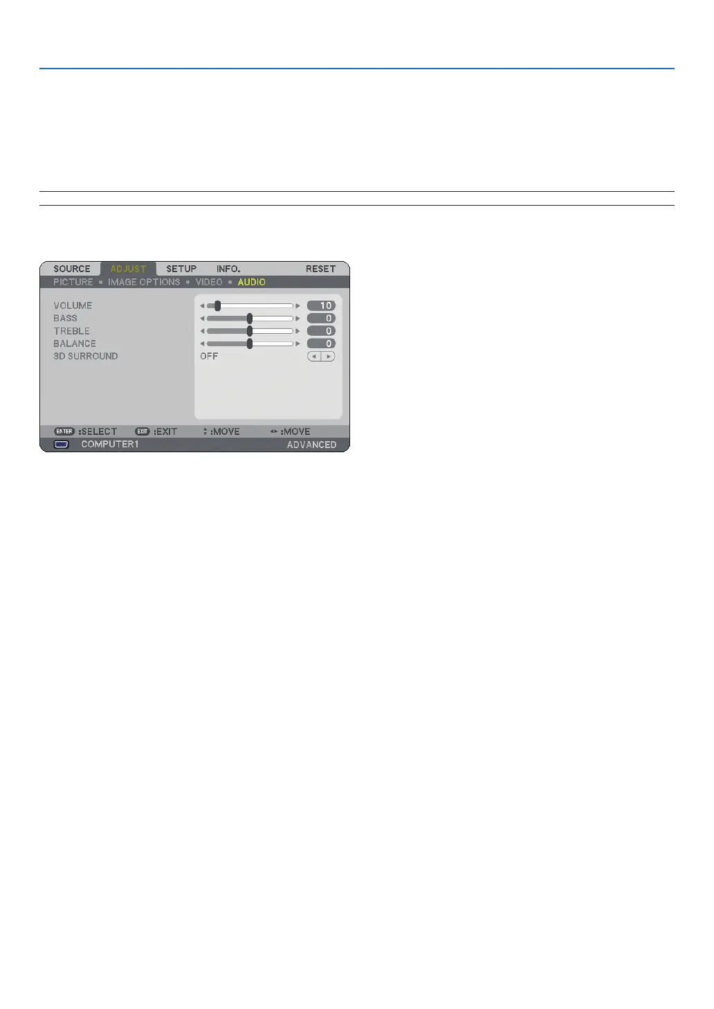 adjustment. If this happens, return the adjustments of the projector to the factory default (BASS:0, TREBLE: 0, 3D