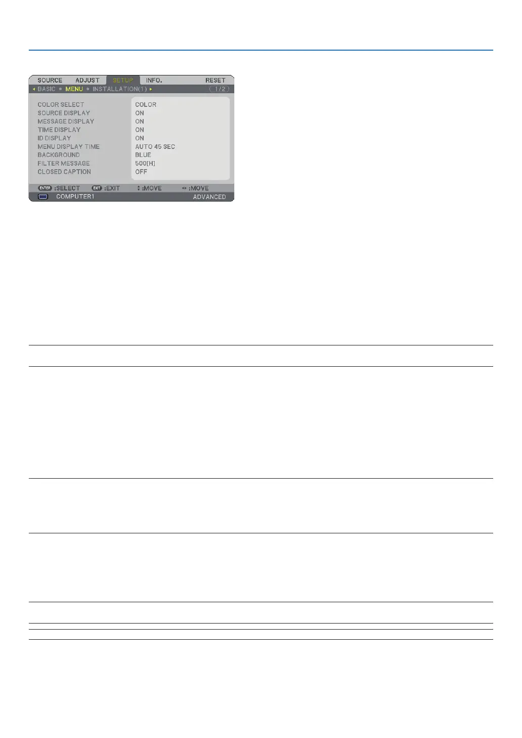SOURCE DISPLAY ........... This option turns on or off input name display such as Computer 1, Computer 2, HDMI, Video, and No Input to be