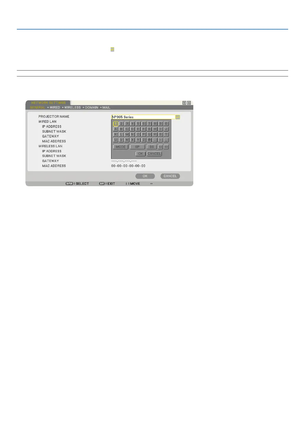 Specify a unique projector name. Press to display the software keyboard and type in. Up to 16 alphanumeric