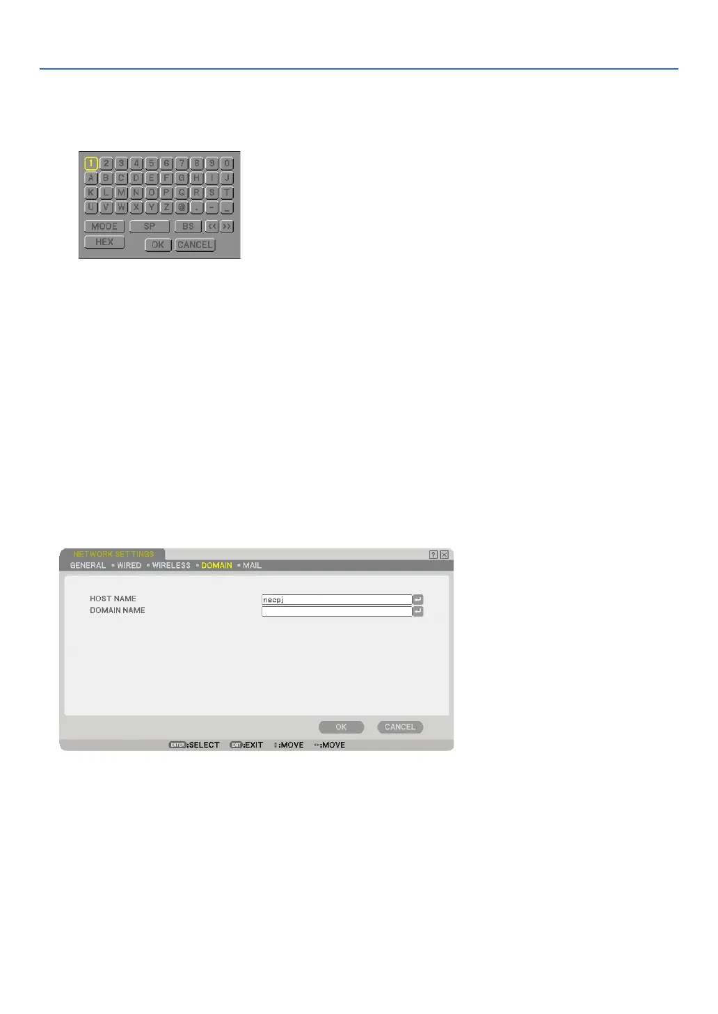 DOMAIN NAME ...... Type in domain name of the network connected to the projector. Up to 60 alphanumeric characters can be
