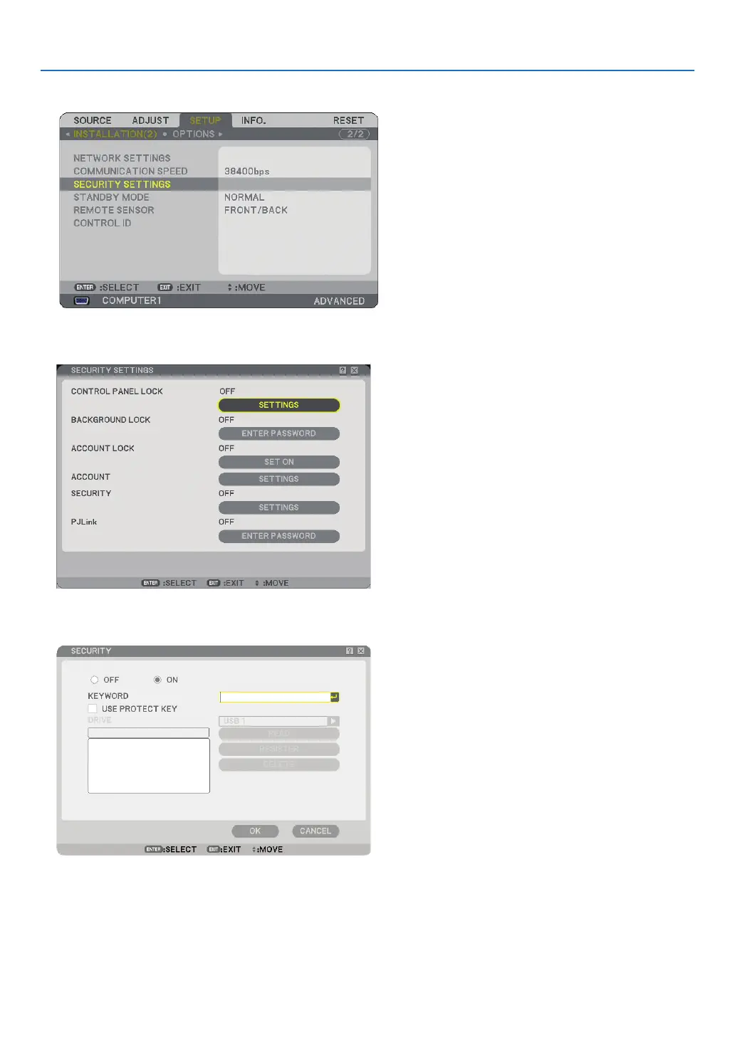 5. Press the ENTER button to display the SECURITY SETTINGS menu.
