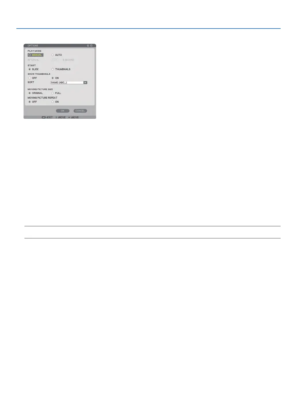 MANUAL ................ Views a slide manually when the Viewer source is selected.