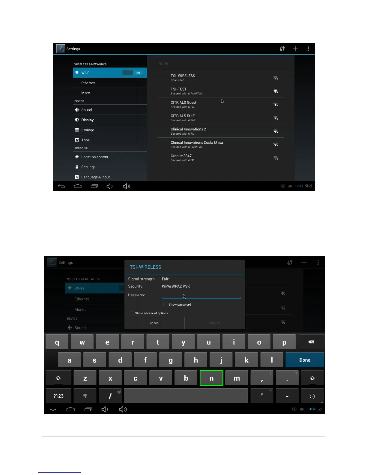 Click on the desired WLAN to connect to. If that network provides security, the following