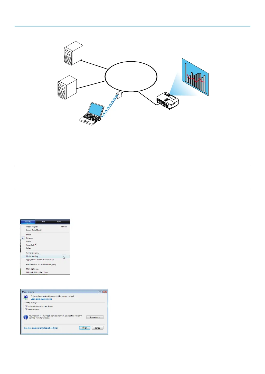 Forcomputer:Prepareimagelesormovielestobeprojected,andsetup“MediaSharing”inWindowsMediaPlayer