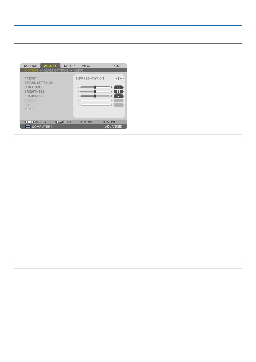 7. Repeatsteps2-6toadjustanadditionalitem,orpresstheEXITbuttonontheremotecontrolortheprojec-