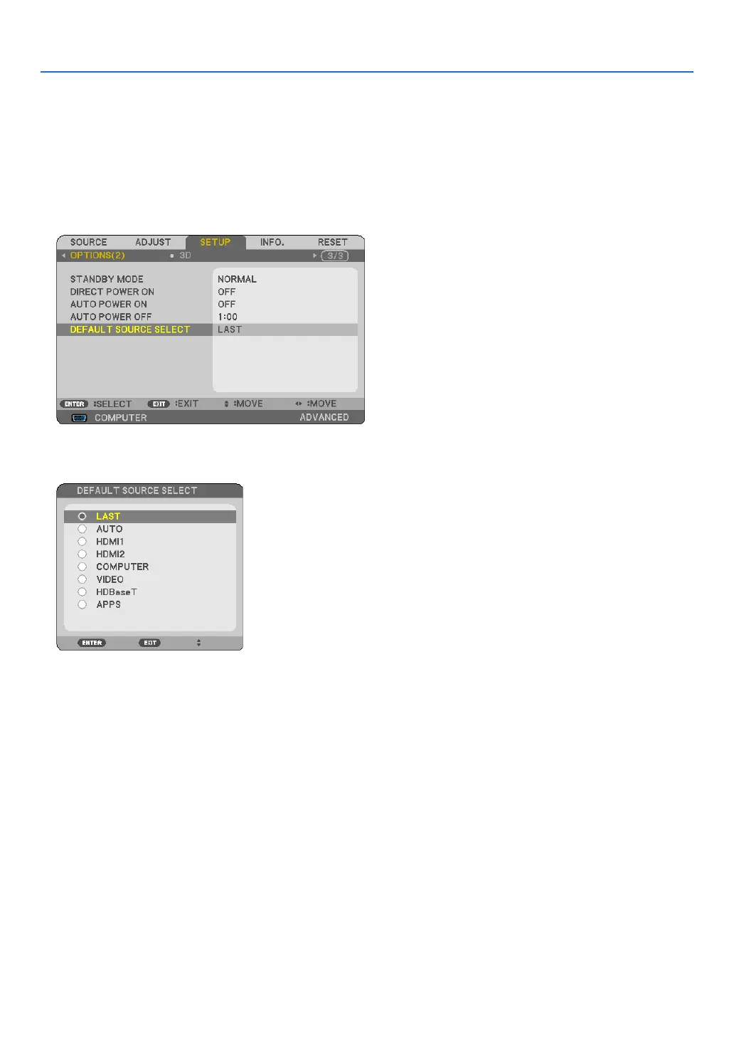 4. Press the ▼buttonvetimestoselect[DEFAULTSOURCESELECT]andpresstheENTERbutton.