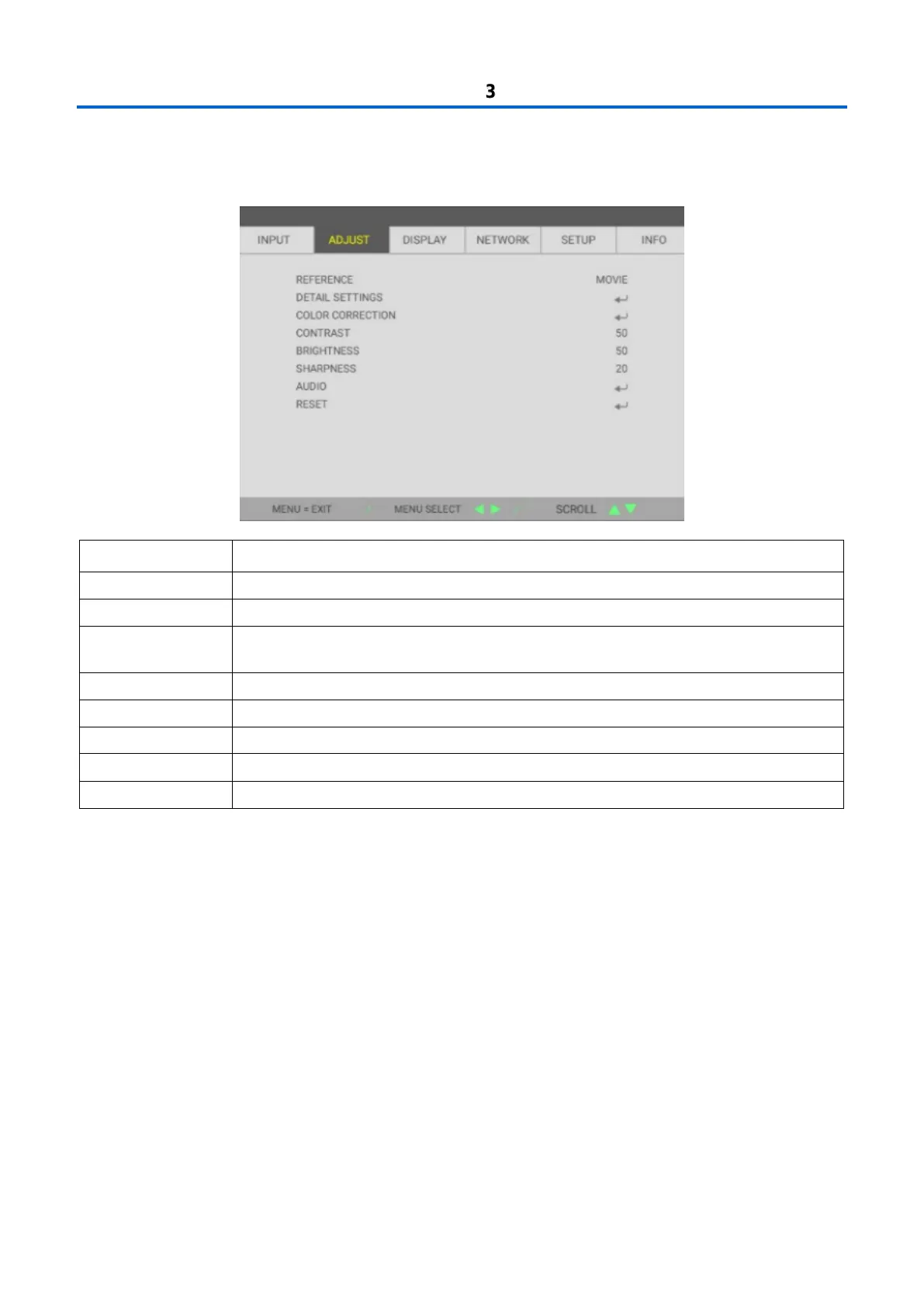 Press the MENU button to open the OSD menu. Press the cursor button to move to the ADJUST Menu. Press the