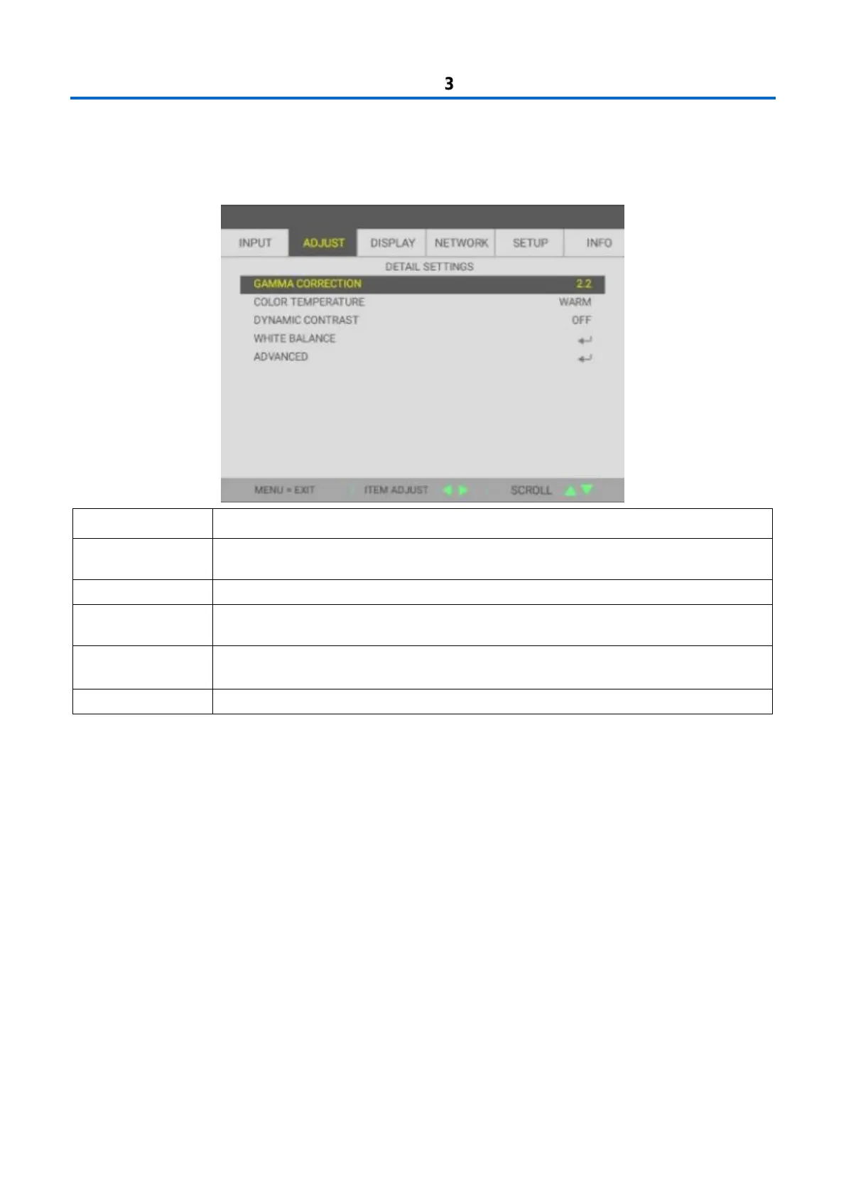 Press the cursor  button to enter and adjust the Gamma Correction of the display.