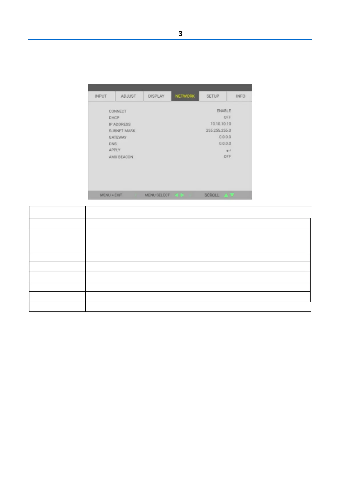 the cursor button to move up and down in the NETWORK menu. Press to enter and change values for