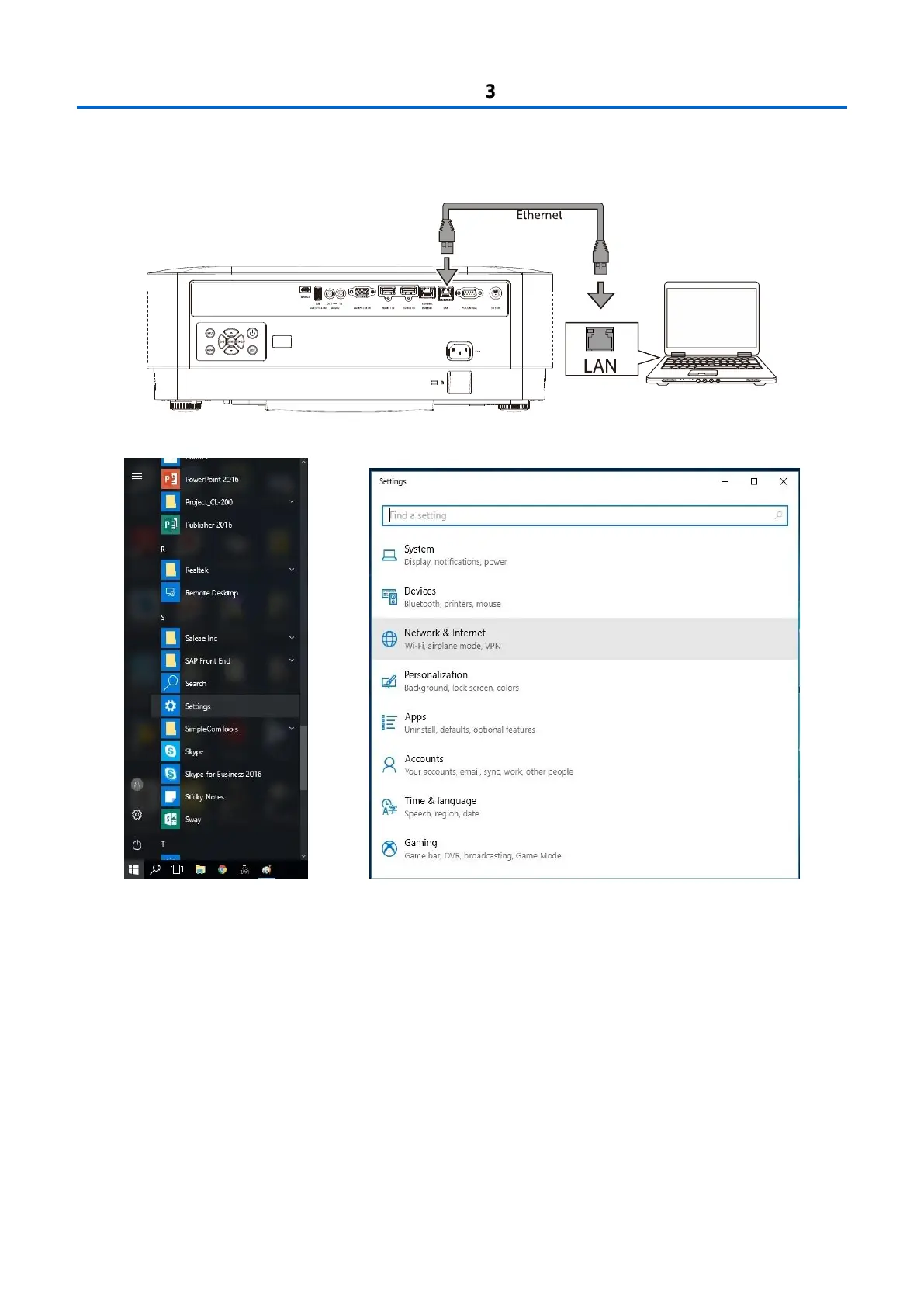 1. Connect an RJ45 cable to RJ45 ports on the projector and the PC (Laptop).
