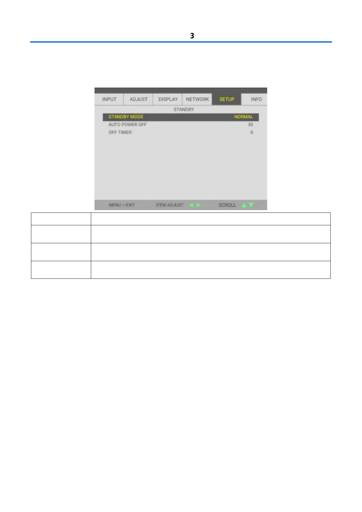 STANDBY MODE menu and then press Enter or . Press  to move up and down in the STANDBY MODE menu.