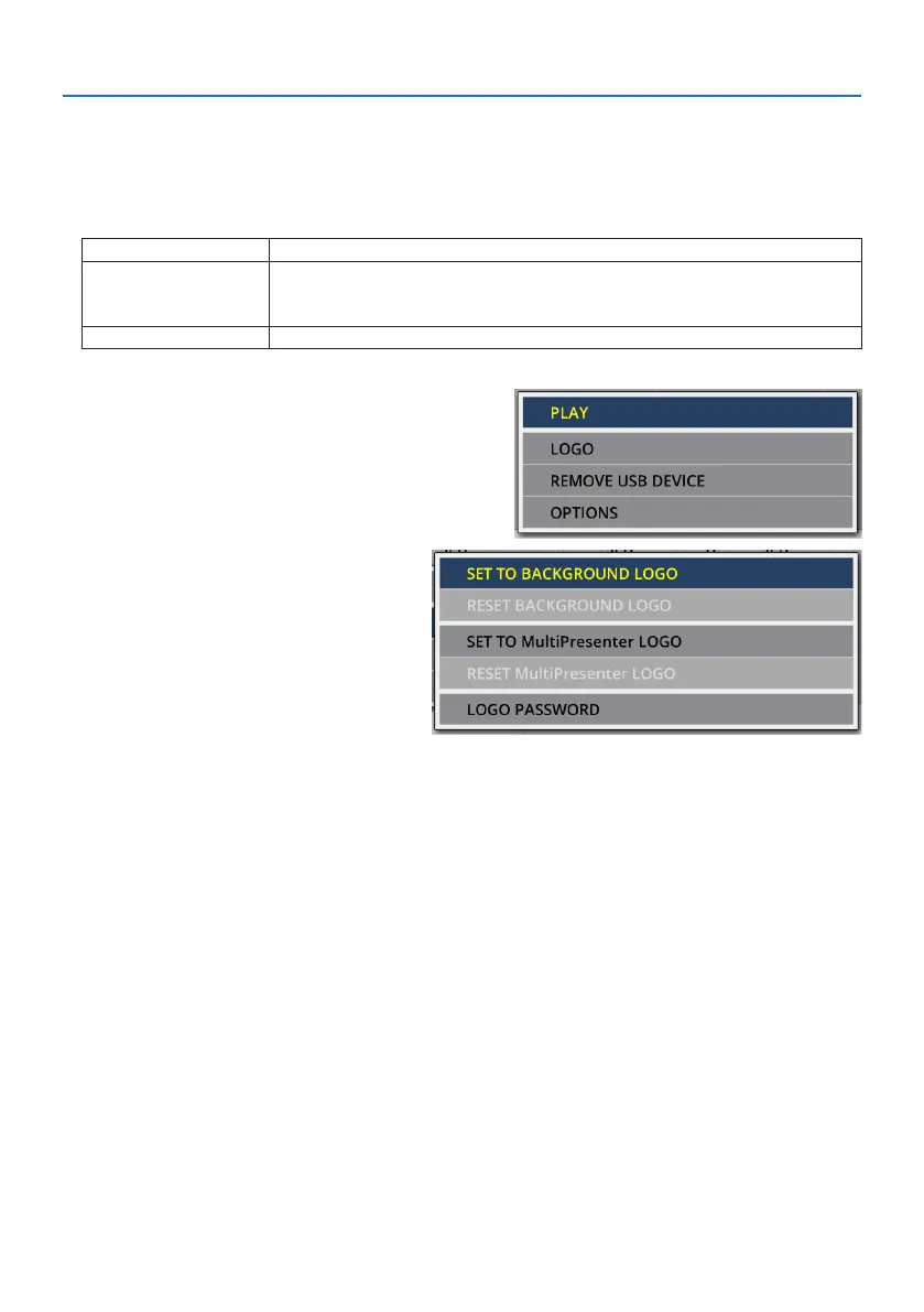 1. Move the cursor to [SET TO BACKGROUND LOGO] or [SET TO MultiPresenter LOGO] in the