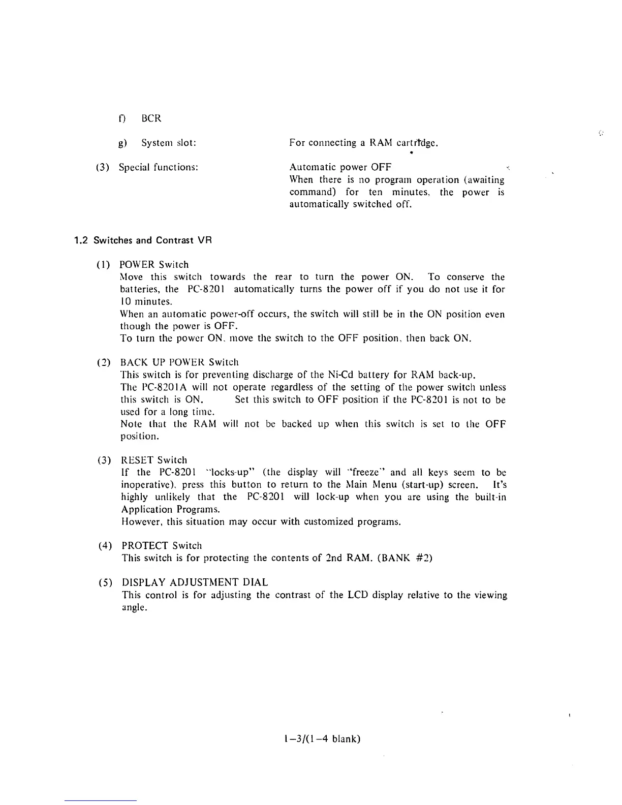 ON. Set this switch to OFF position if the PC-8201 is not to be