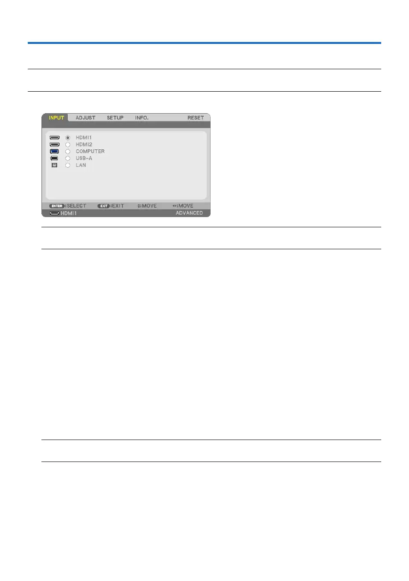 3. PresstheENTERbuttonontheremotecontrolortheprojectorcabinettohighlightthe