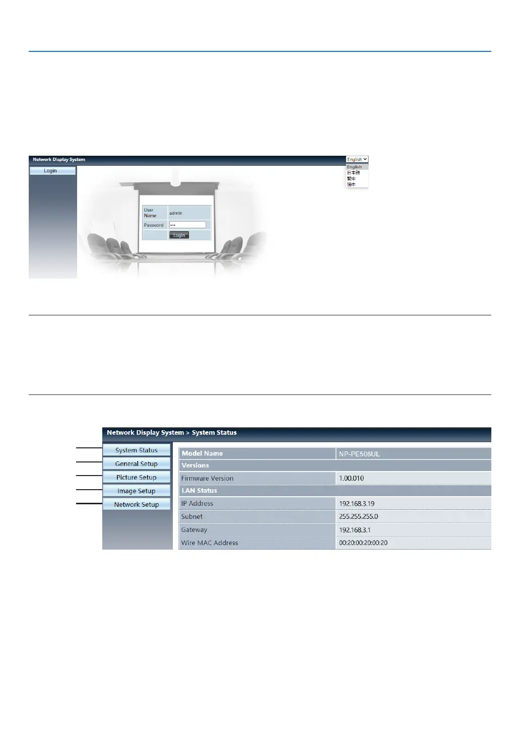 2) Enter the IP address on the projector set in the URL input field of the Web browser. The "Network Display System"