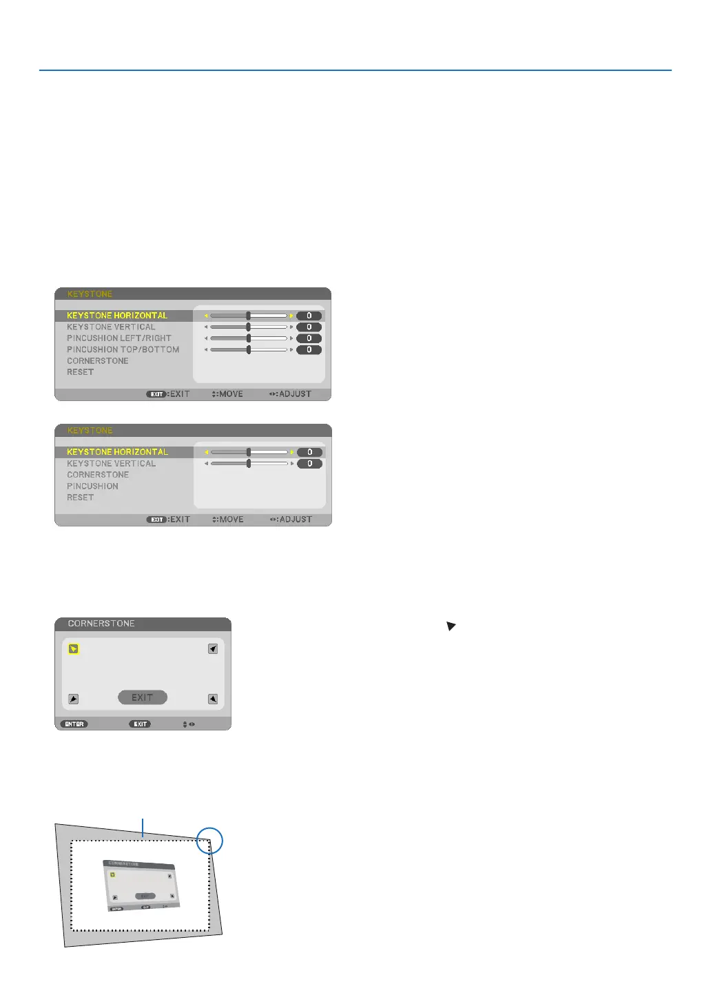 Usethe[CORNERSTONE]and[PINCUSHION]featurestocorrectkeystone(trapezoidal)distortiontomakethetop