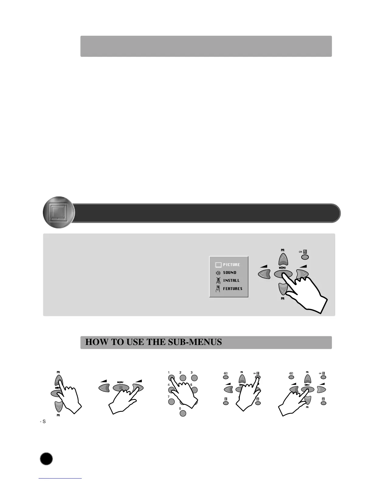 The sub-menus referred to here are: PICTURE, SOUND, INSTALL, FEATURES.