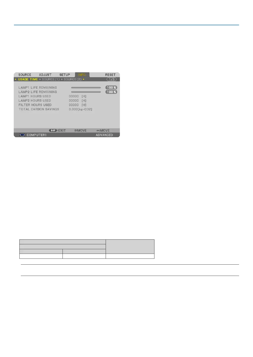 Thevalueinformsyouoftheamountoflampusage.Whentheremaininglamptimereaches0,theLAMPLIFE