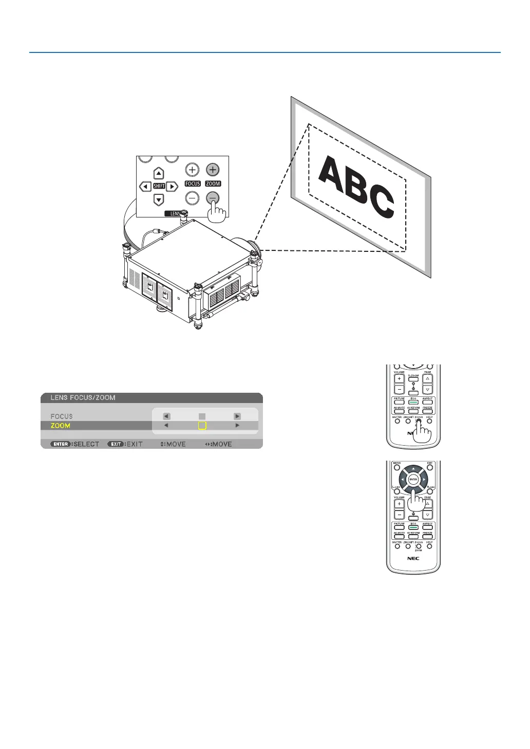 UsetheZOOM(+)or(−)buttonontheprojectorcabinettozoominorout.