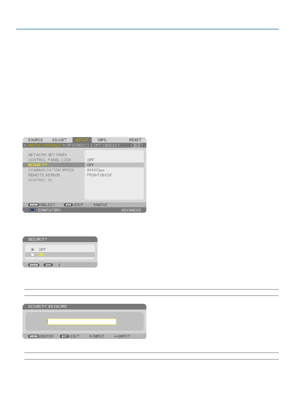 AkeywordcanbesetforyourprojectorusingtheMenutoavoidoperationbyanunauthorizeduser.Whenakeyword