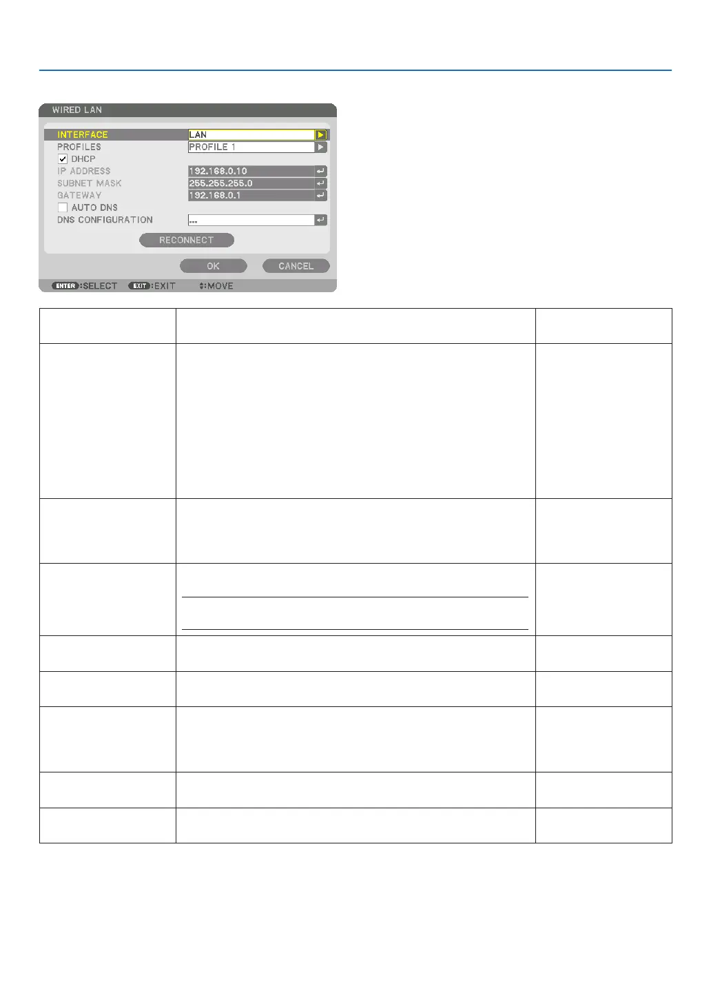 • ThesettingsforthewiredLANcanberecordedintheprojector