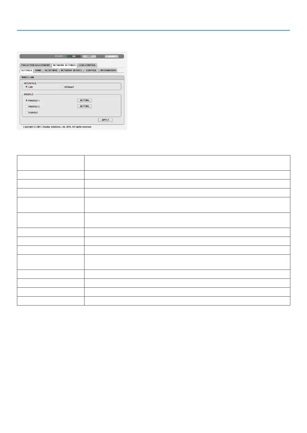 PROFILE1/PROFILE2 TwosettingscanbesetforwiredLANconnection.SelectPROFILE1orPROFILE2.