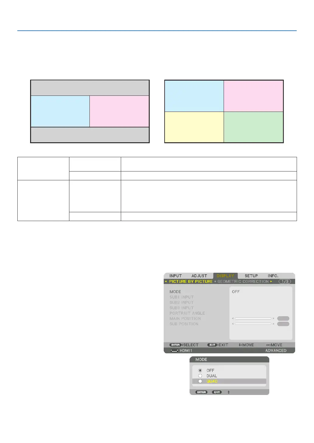 • The projection video in the rst screen display is known as the MAIN display while the projection video