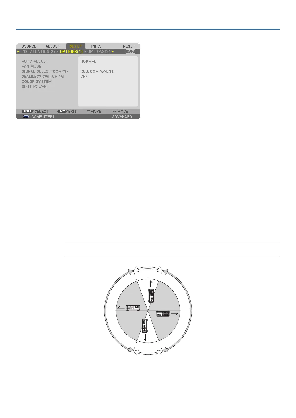 NOTE:Besuretoselectthe[SETTING]optionaccordingtotheprojector’sorientation.Failuretodosomay