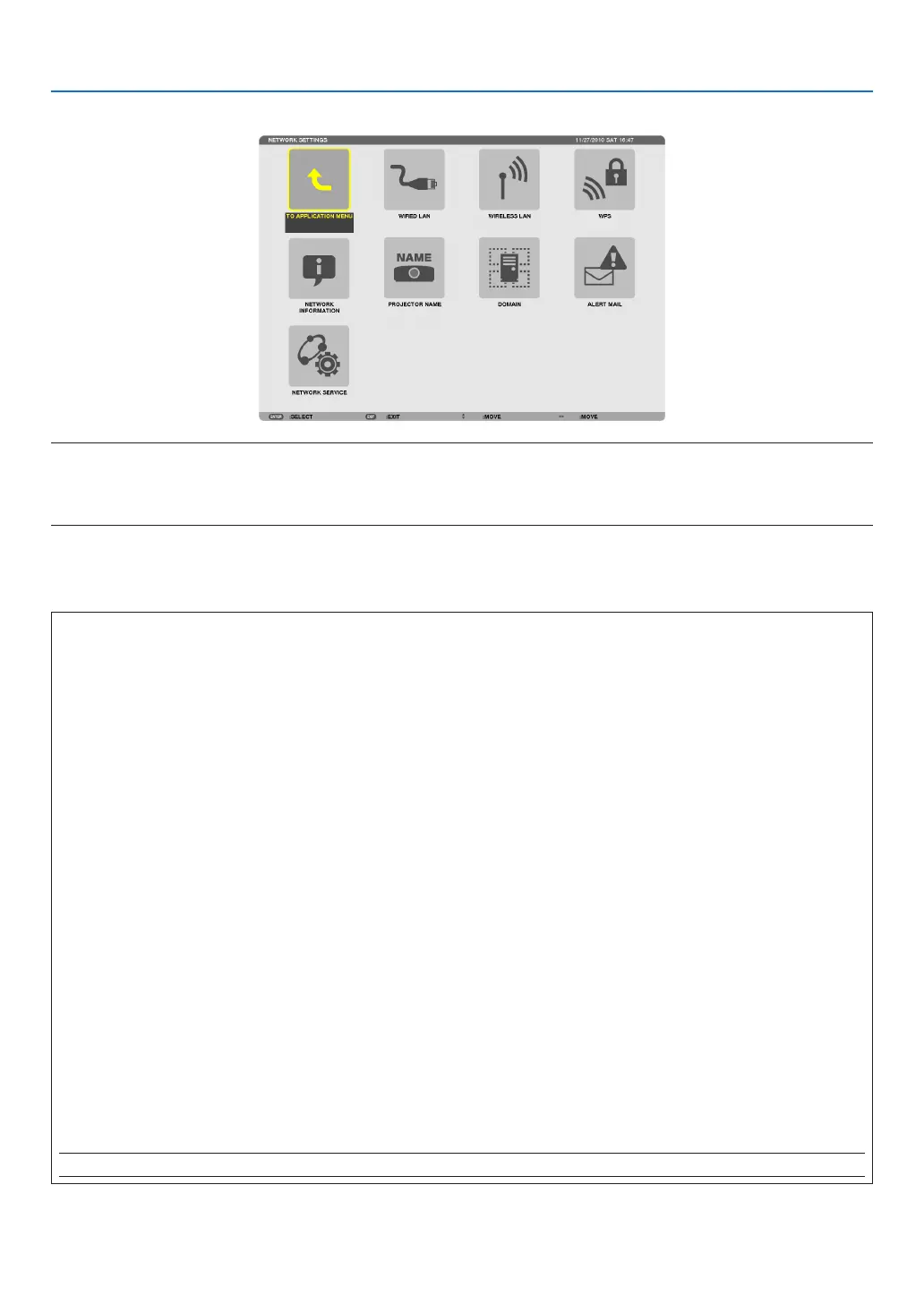 TIP:Thenetworksettingsyoumakewillnotbeaffectedevenwhen[RESET]isdonefromthemenu.