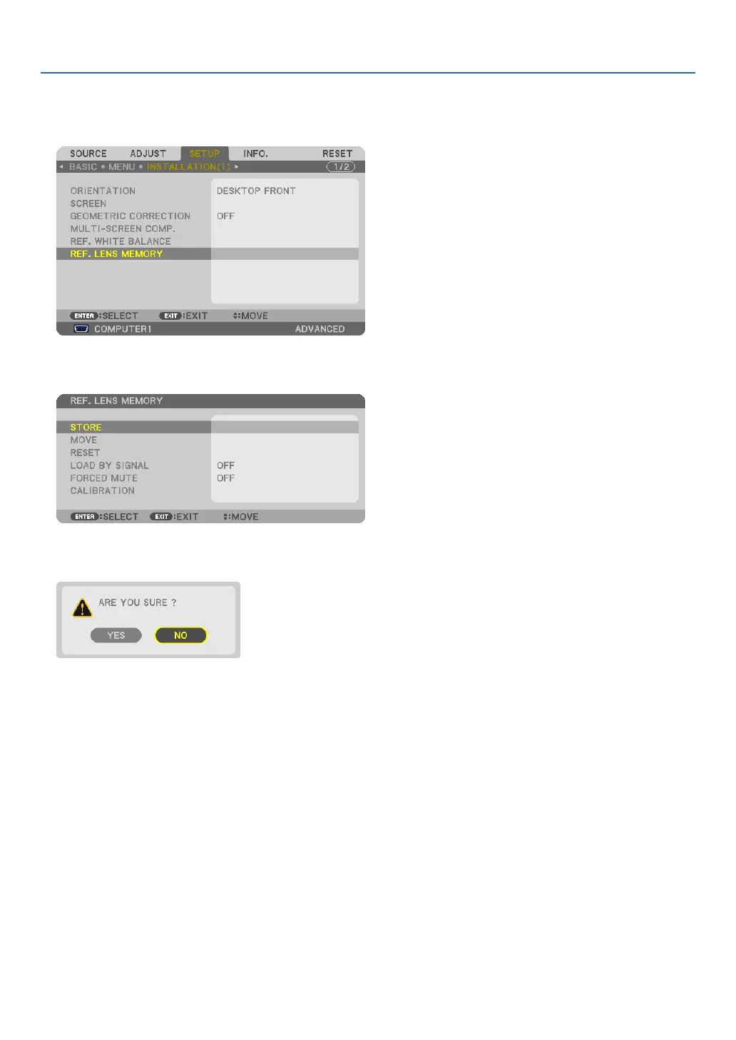 The adjusted values for lens shift, zoom, and focus have been stored in [REF. LENS MEMORY].