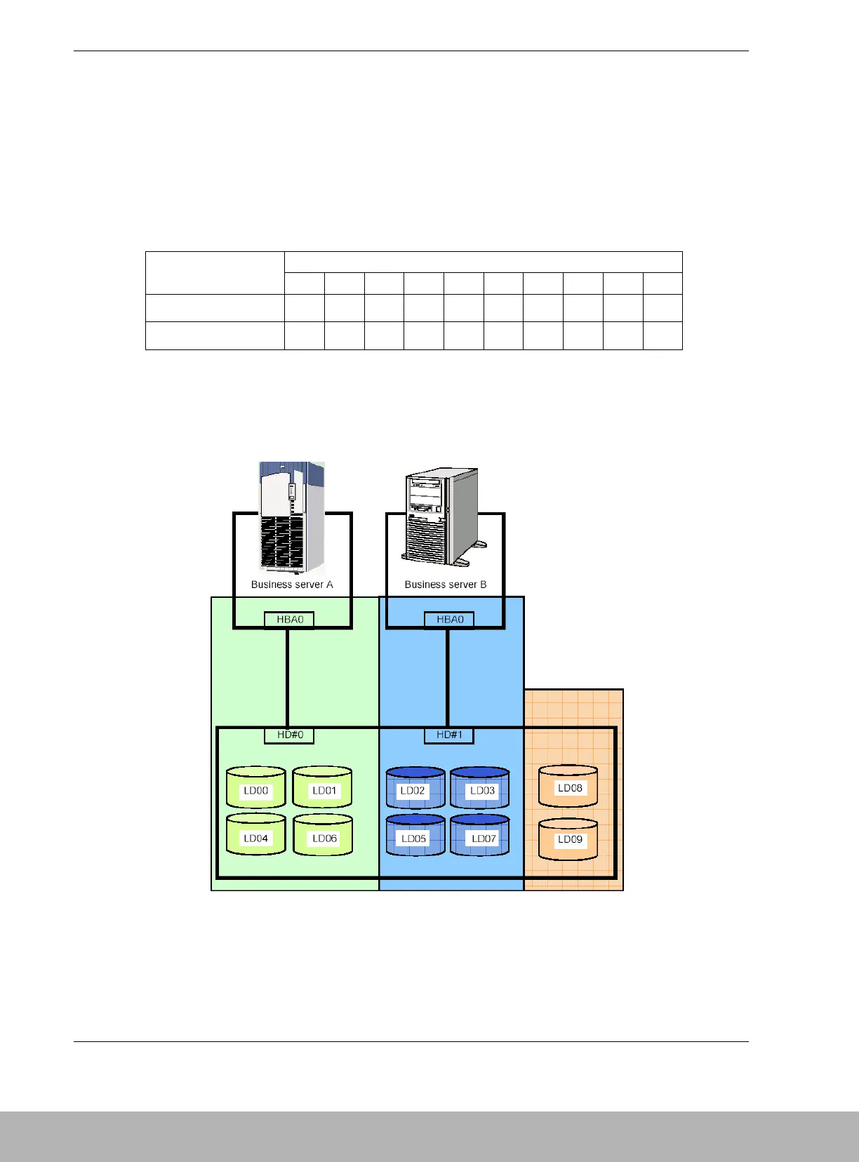 LD06 while business server B can access logical disks LD02, LD03, LD05, and LD07.