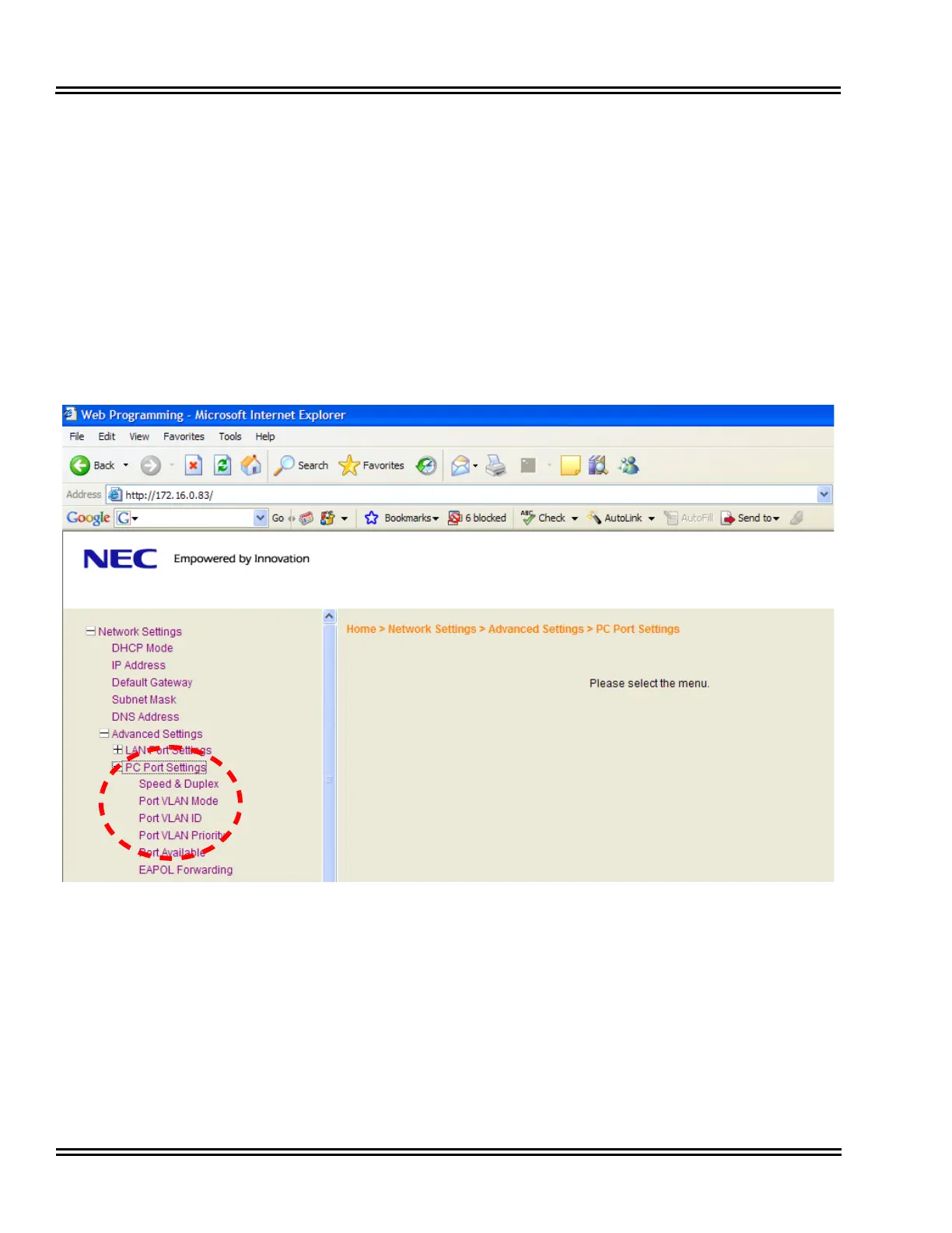 Network Settings>Advanced Settings>PC Port Settings.