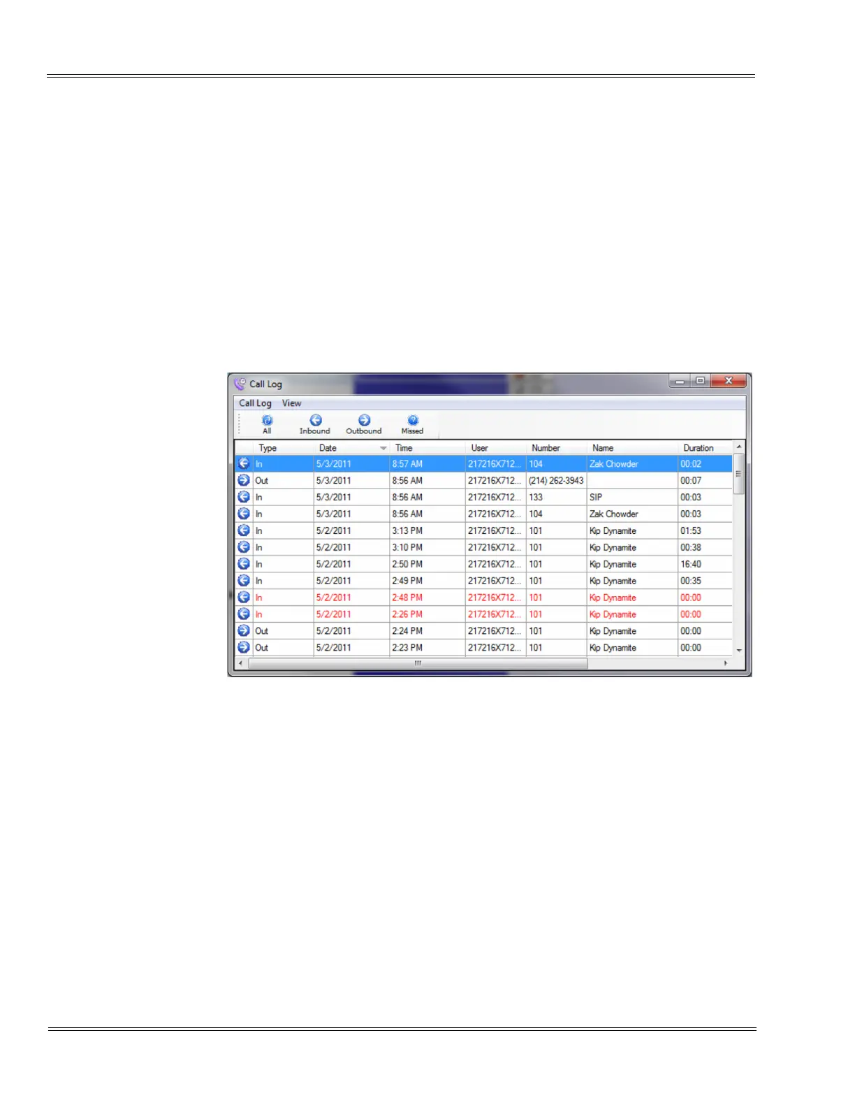 Figure 3-20 Call Log Screen shows an example of the Call Log View.