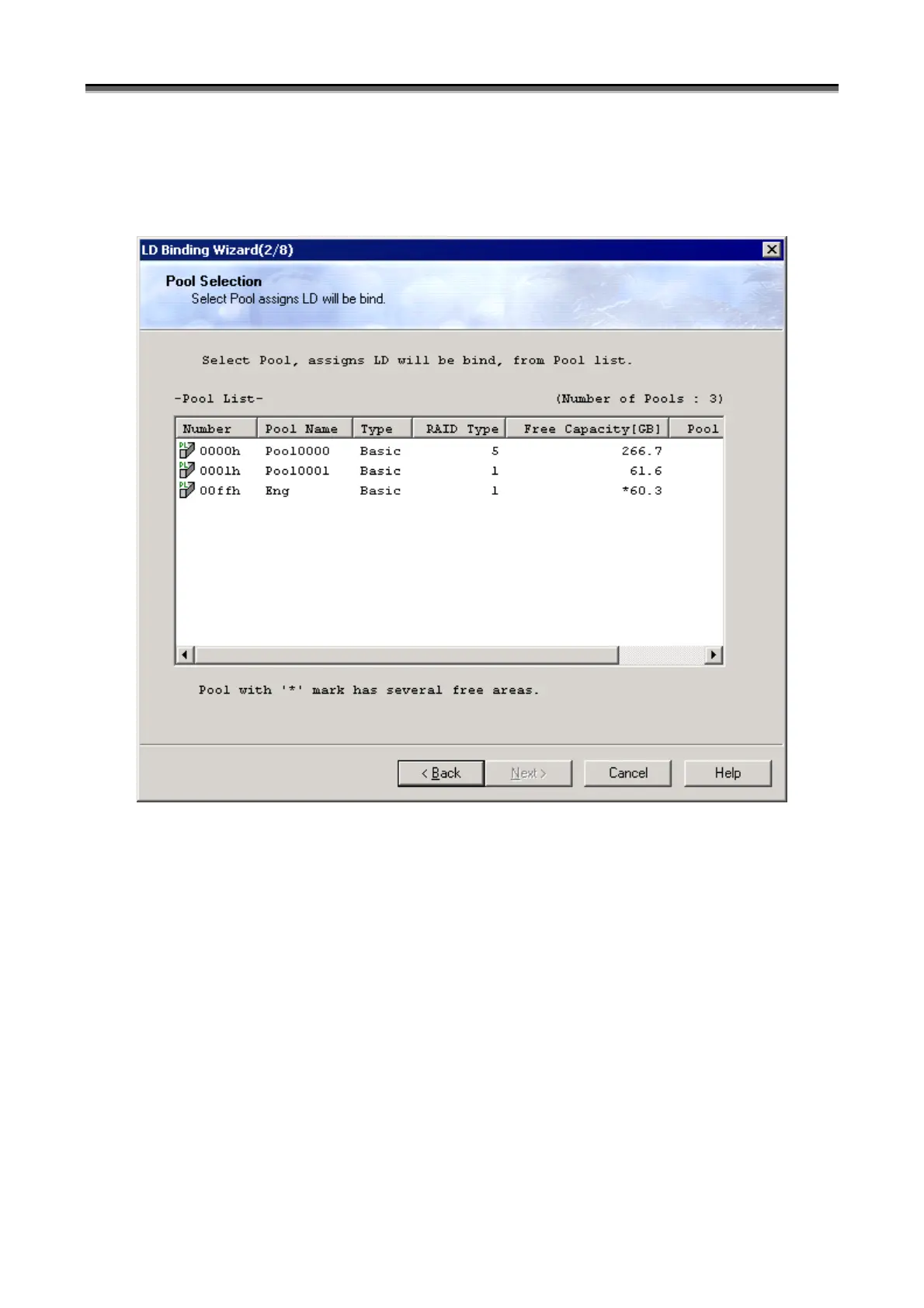 Clicking the [Next] button on the “Welcome to the LD Binding Wizard” screen displays the “Pool Selection”