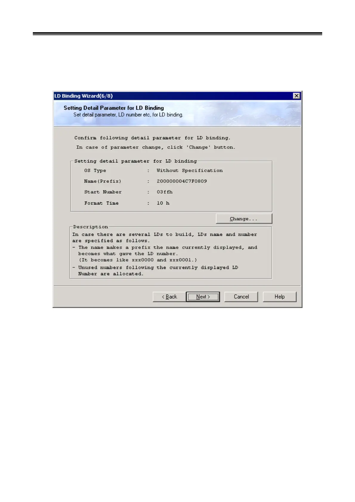 The “Setting Detail Parameter for LD Binding” screen allows checking for and changing the format, name, and