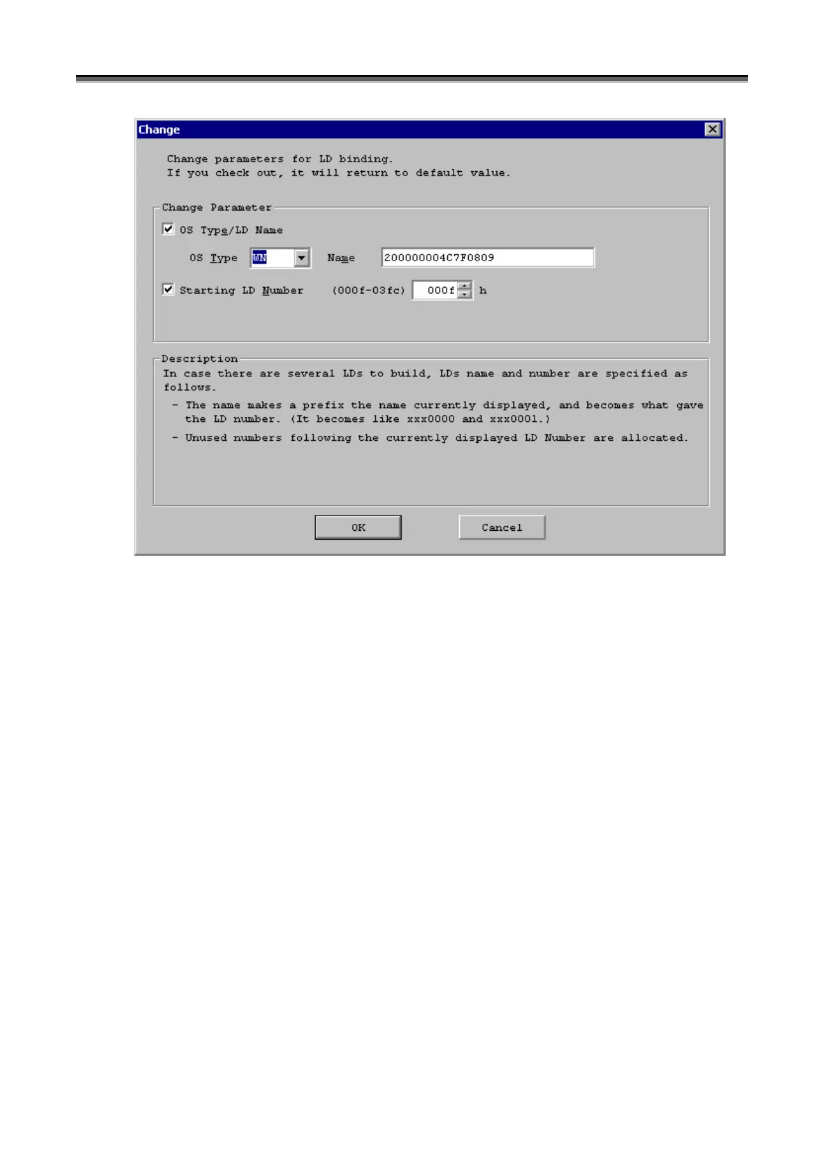 [Cancel] button: Displays back the screen for specifying the details of the logical disks. All parameter