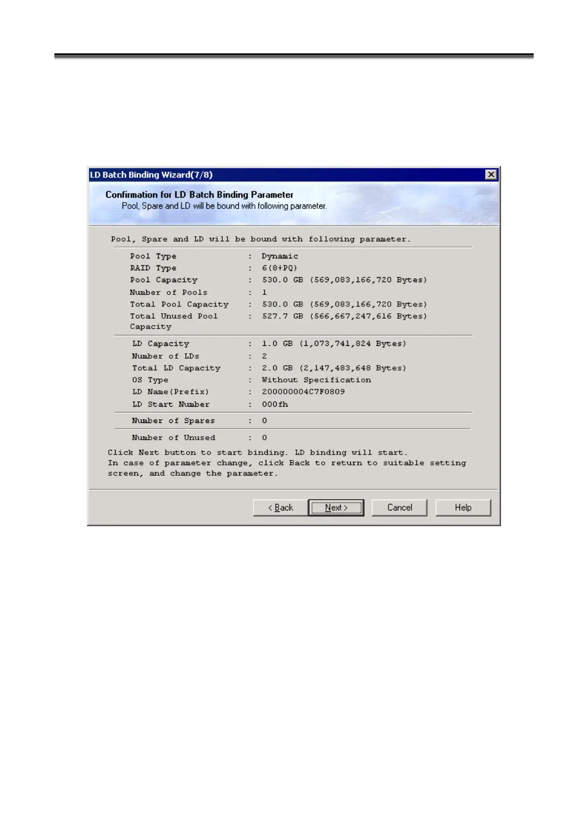 for LD Batch Binding Parameter” screen. Check for the parameters specified for batch binding the logical disks,