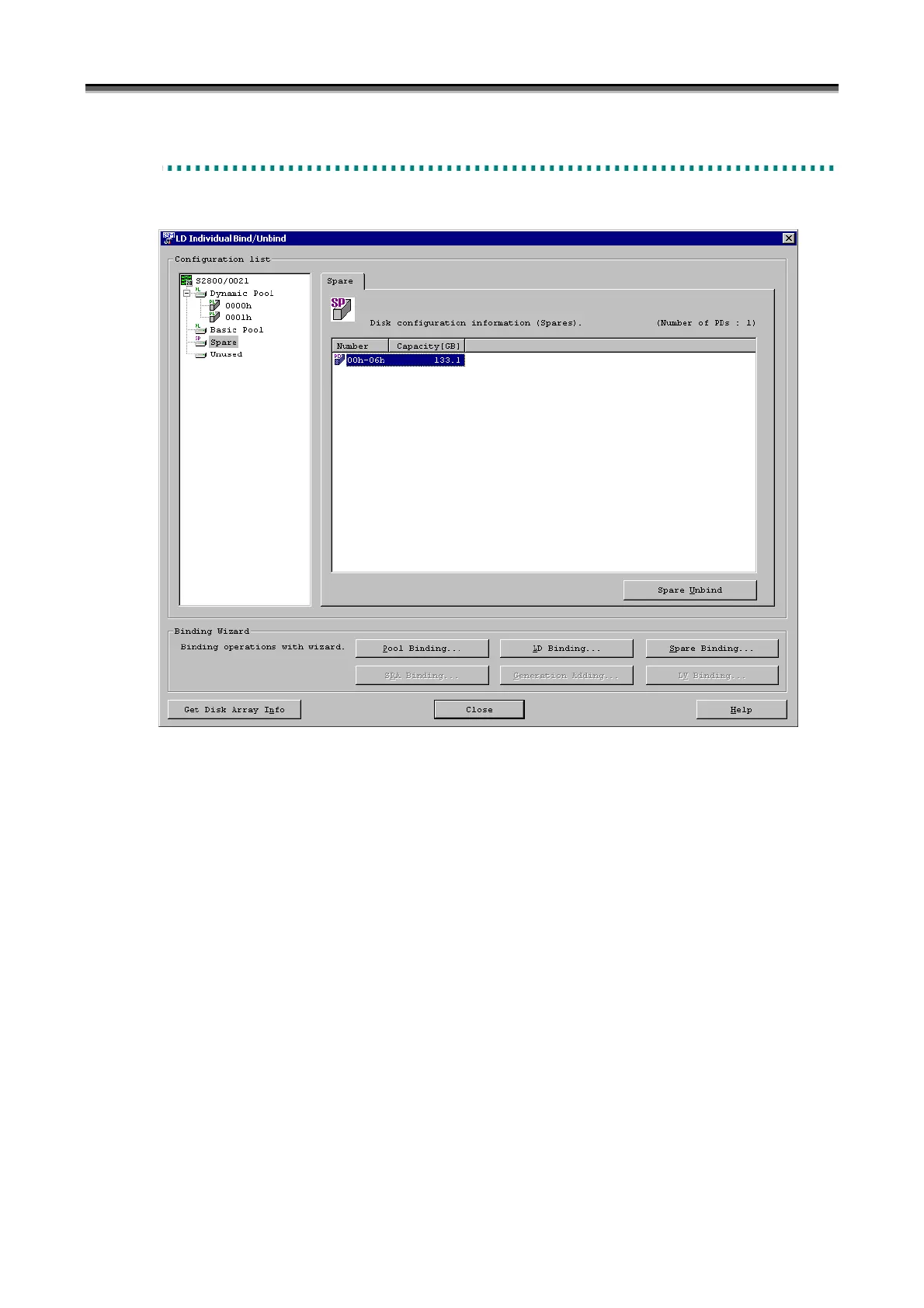 Selecting Spare in the configuration tree view shows a list of spares. You can unbind spares on this screen.