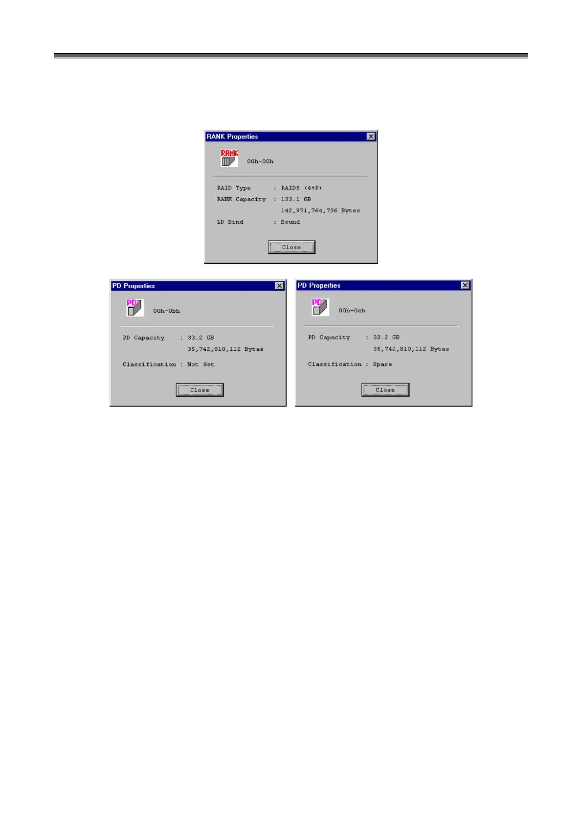 The properties of selected RANKs, unused PDs and Spares are displayed as shown below.