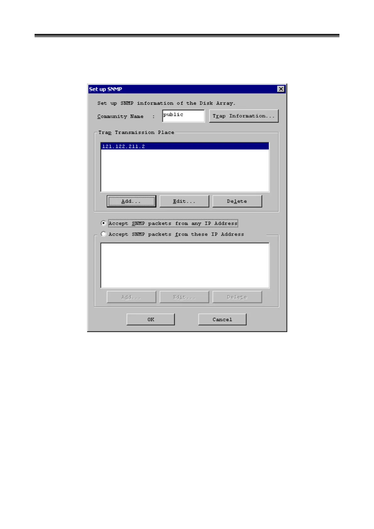 Set the SNMP (Simple Network Management Protocol) information of the disk array.