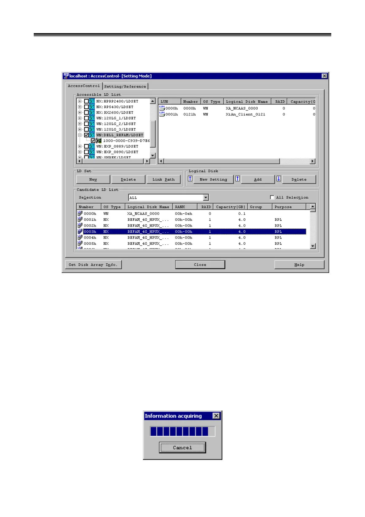 After clicking this button and while information is being acquired from the disk array, the following dialog screen