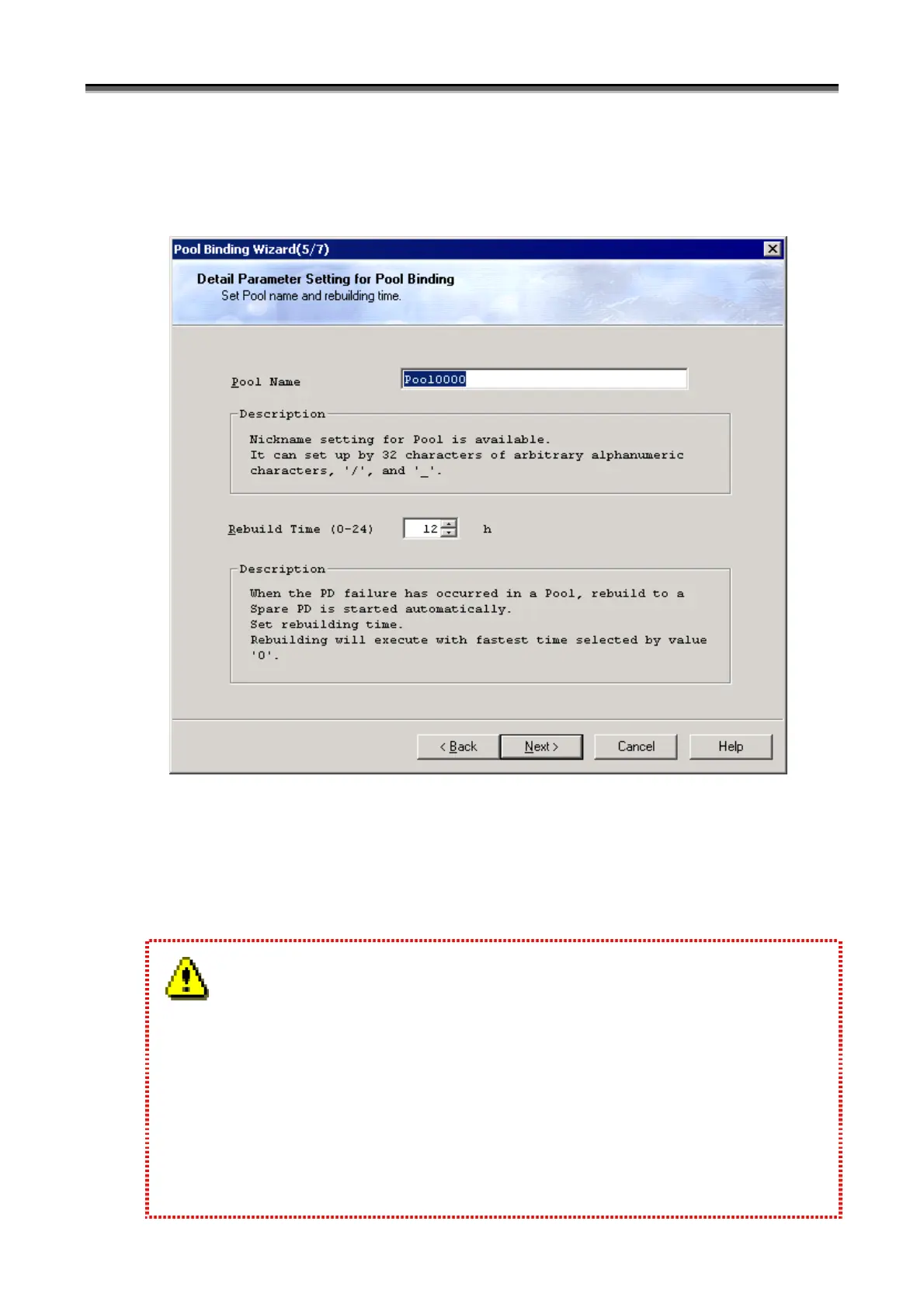 Clicking the [Next] button on the “PD Selection” screen displays the “Detail Parameter Setting for Pool Binding”